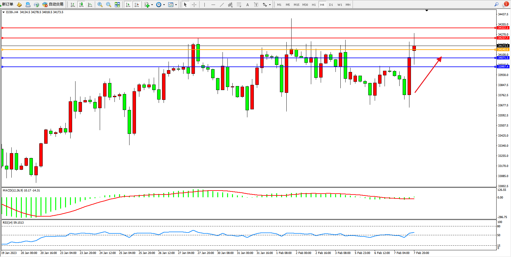 道琼斯指数DJ30——4小时K线图显示:
