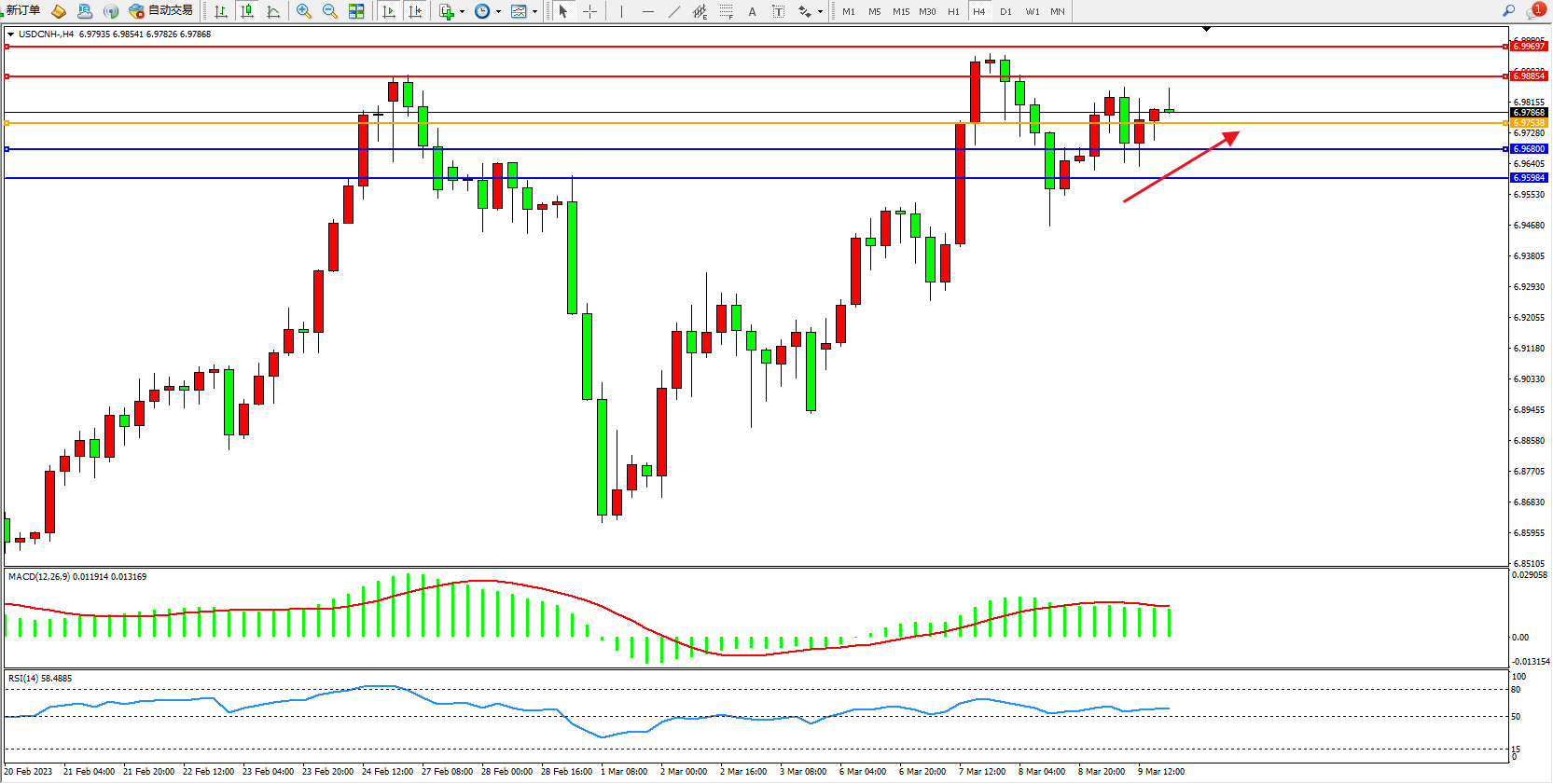 美元人民币USDCNH——4小时K线图显示:
