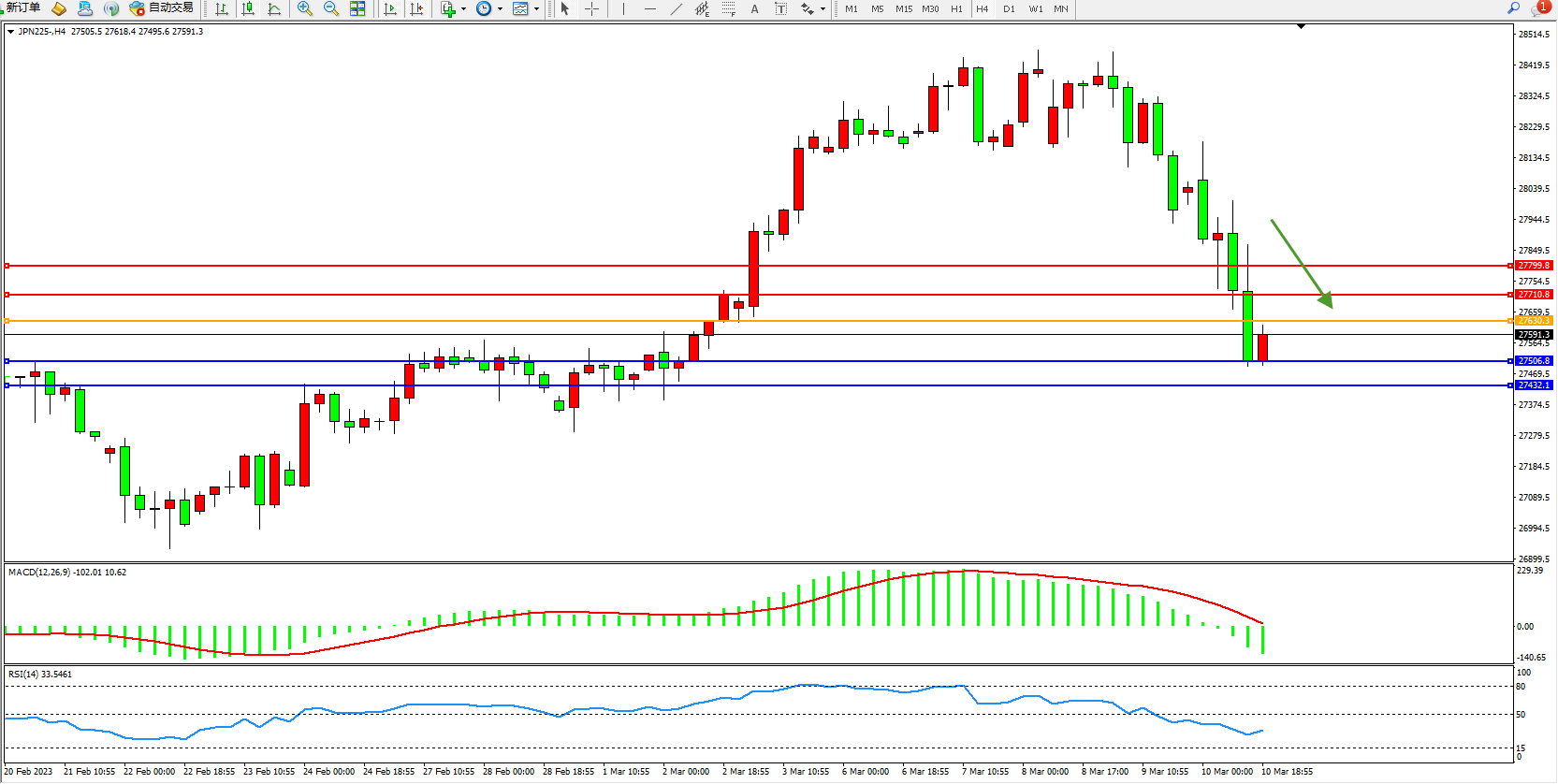 日经指数JPN225——4小时K线图显示: