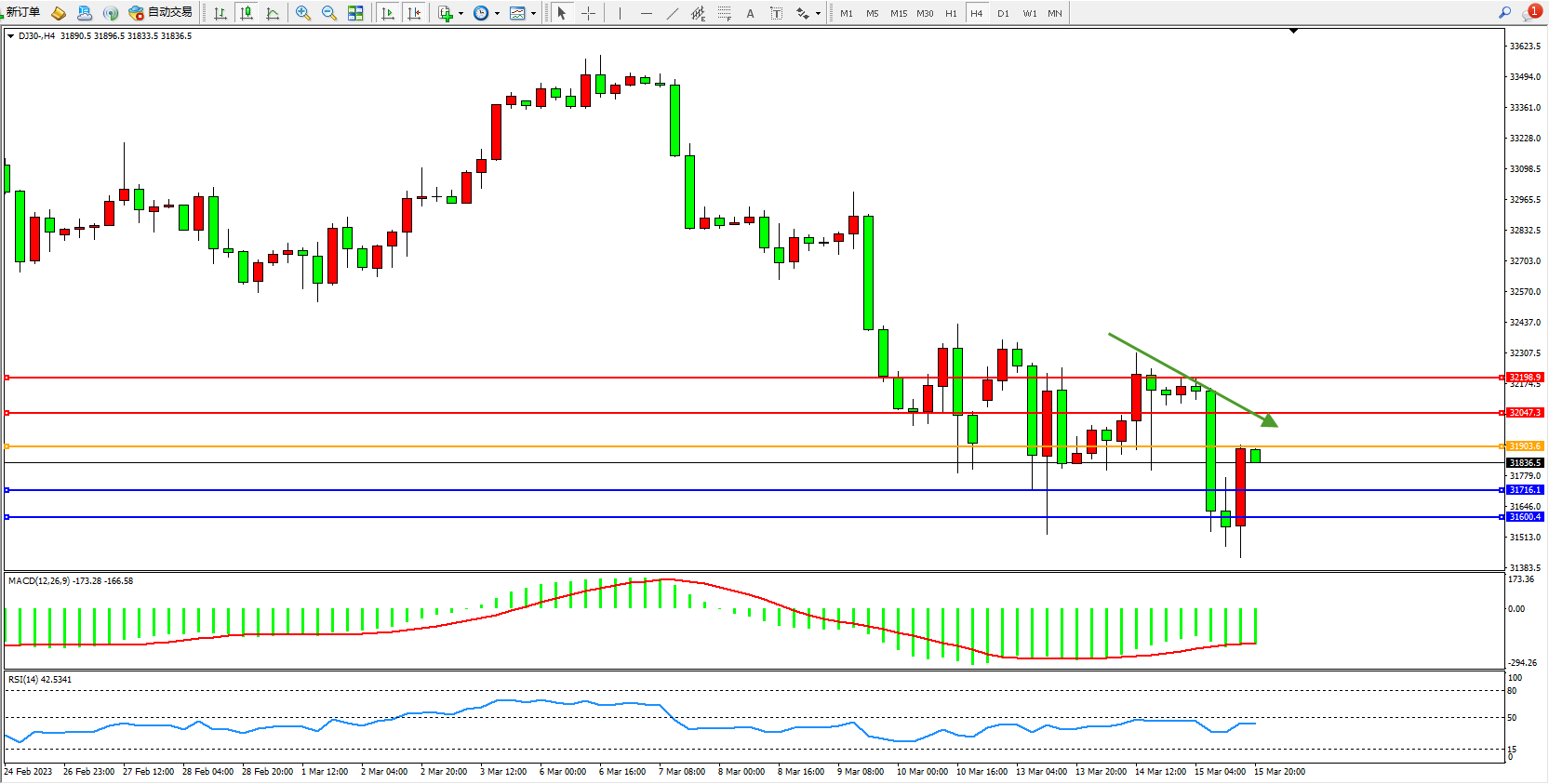 道琼斯指数DJ30——4小时K线图显示: