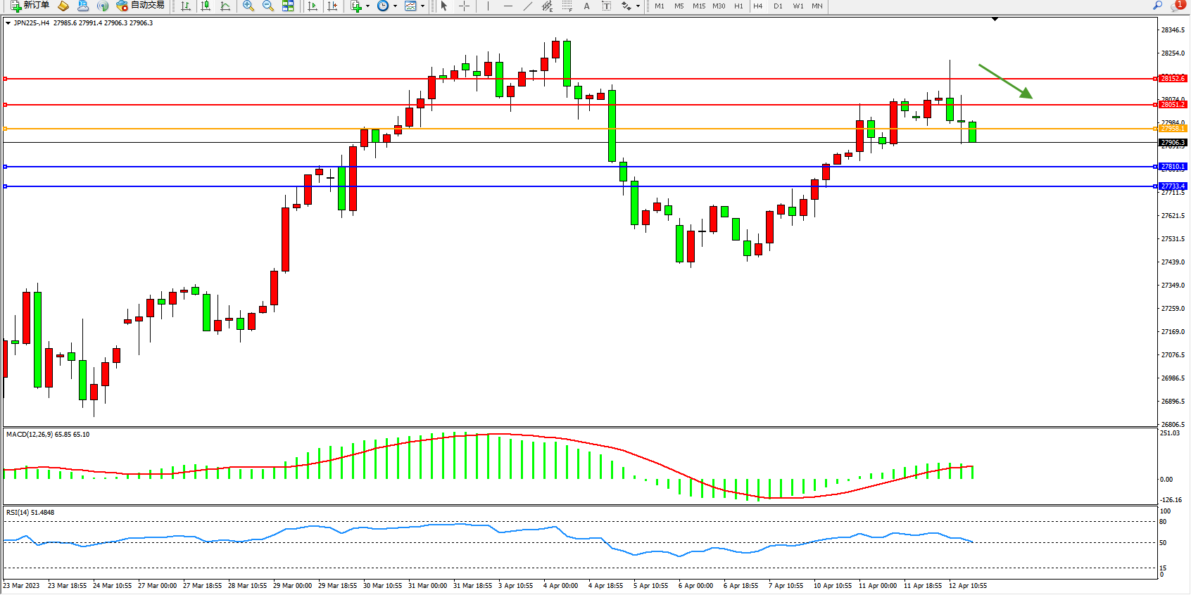 日经指数JPN225——4小时K线图显示: