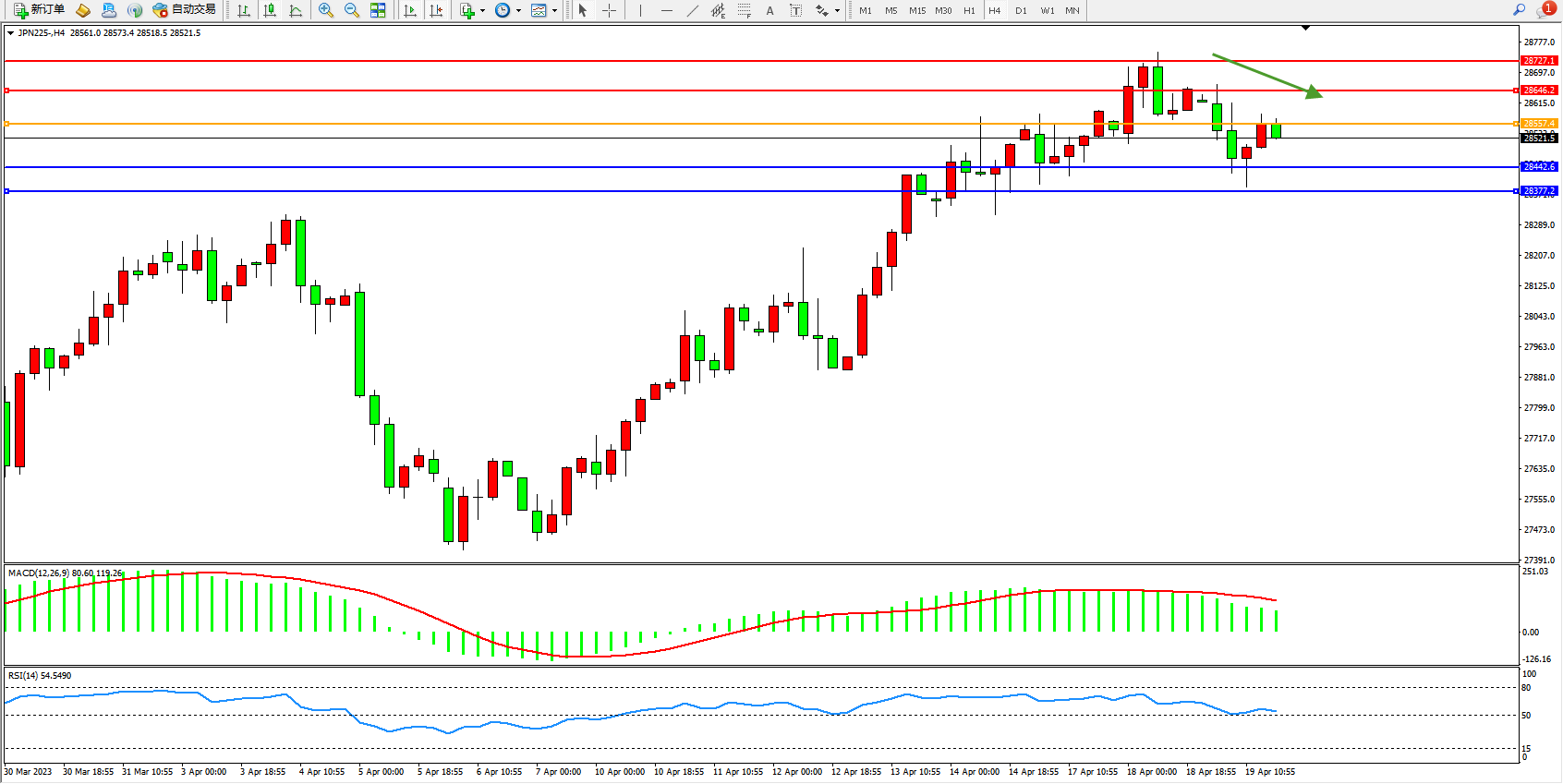 日经指数JPN225——4小时K线图显示: