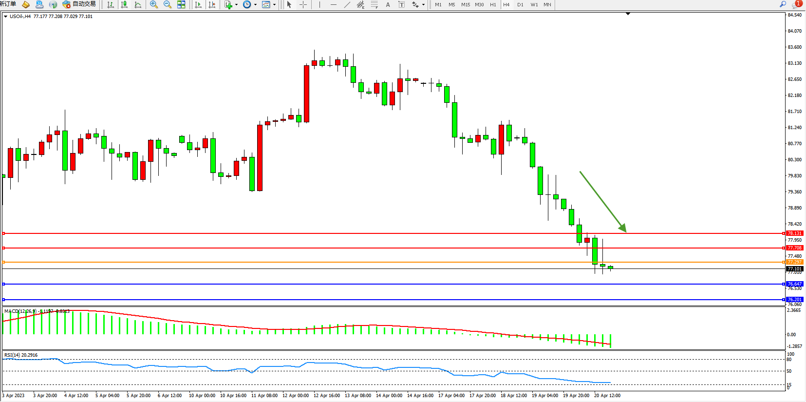 交易策略:77.297下方看跌,目标76.647 76.201