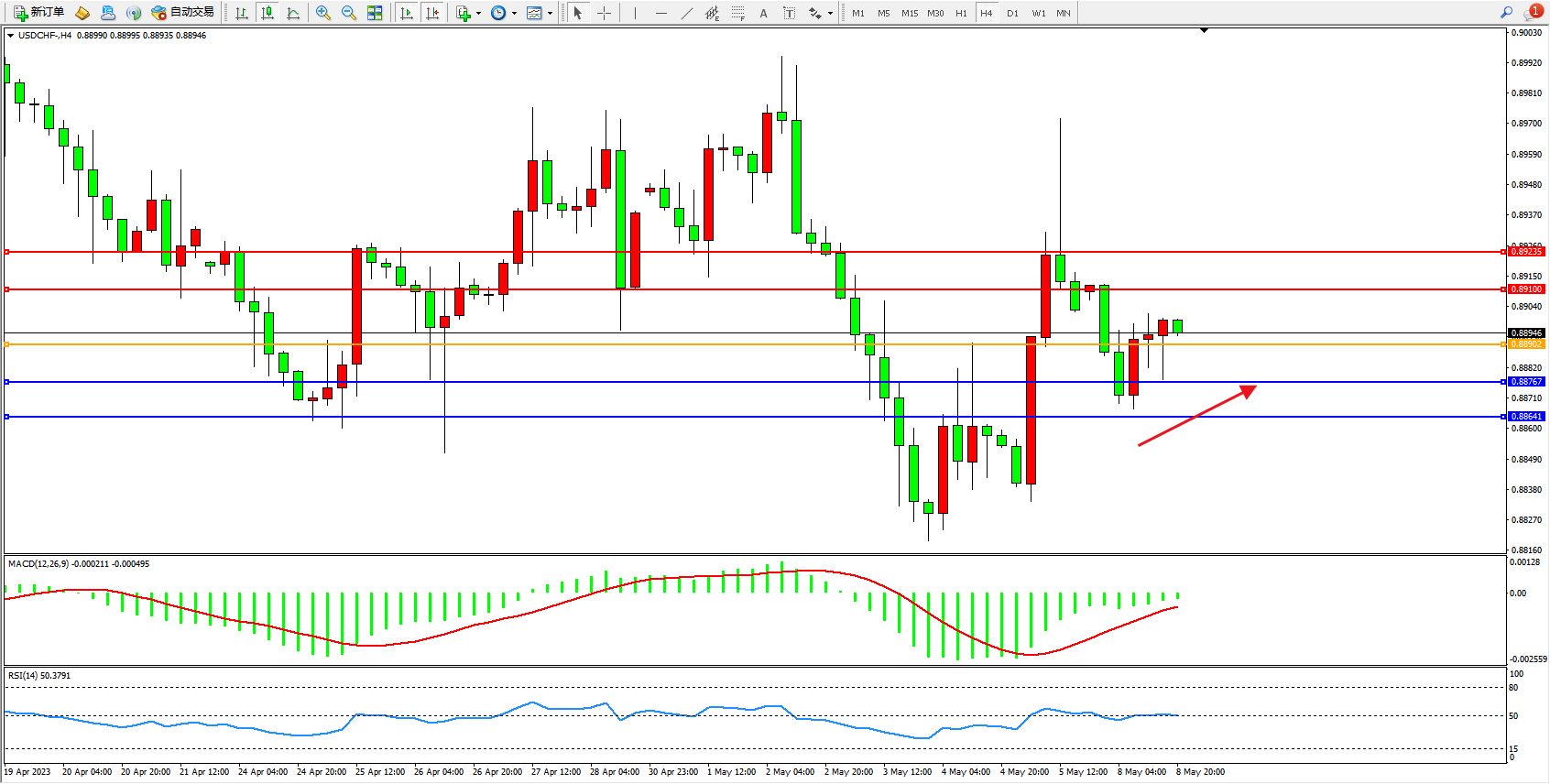 美元瑞郎USDCHF——4小时K线图显示: