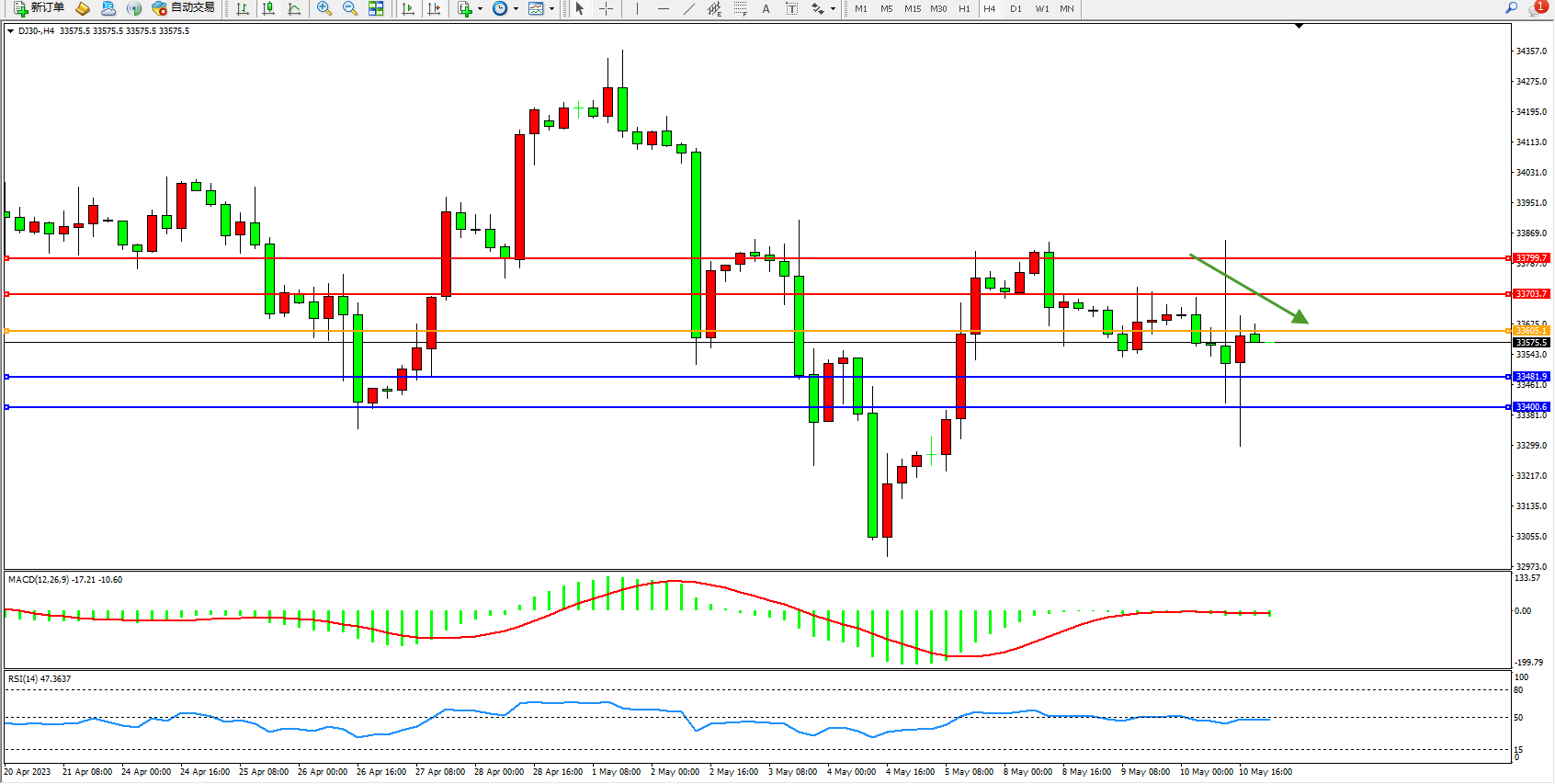 道琼斯指数DJ30——4小时K线图显示: