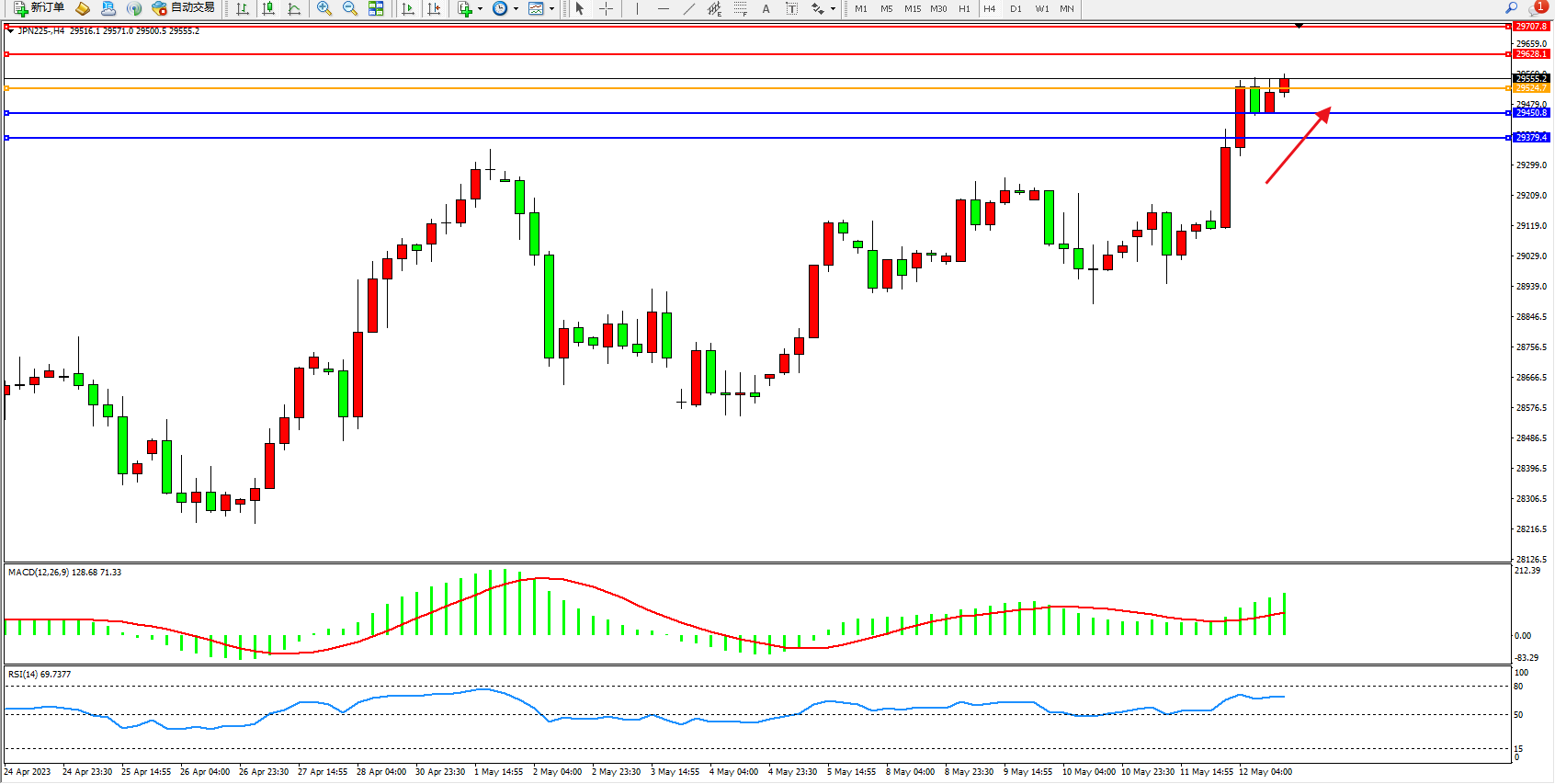 日经225指数5月12日(周五)收盘上涨276.78点,涨幅0.95%,报29403.50点。日本核心CPI可能会在4月再次加速,因为一系列零售价格上涨抵消了政府能源补贴的影响。
