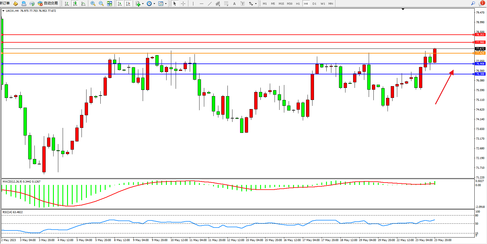 交易策略:77.429上方看涨,目标77.980 78.353