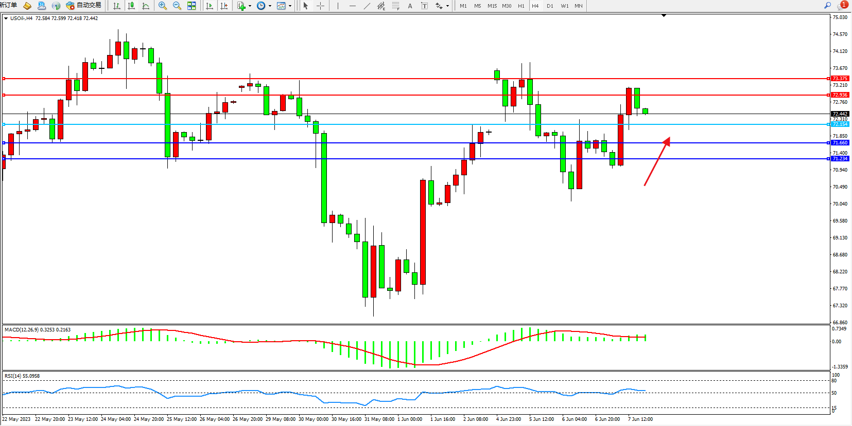 原油USOil——4小时K线图显示: