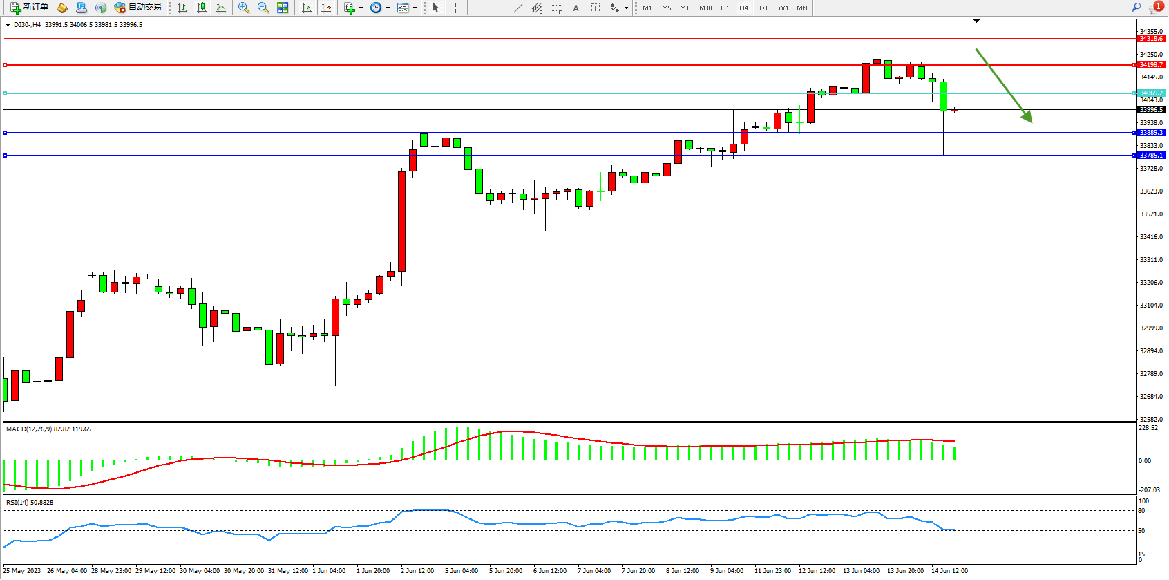道琼斯指数DJ30——4小时K线图显示: