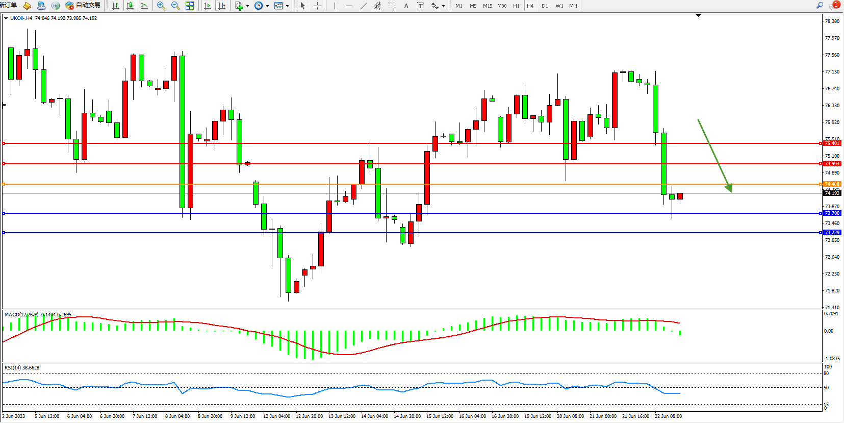 4小时图看:空头动力强势下挫,短期跌势或将延续,市场整体处于空头下行中,MACD指标处于0轴线下侧徘徊,RSI指标处于50均衡线下侧弱势整理;
