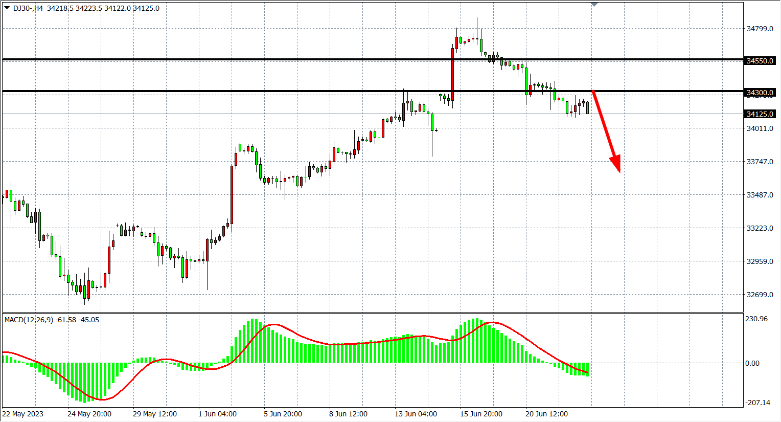 4小时图看,道指跌破34200进一步走低,MACD量能在零轴下小幅放量,行情回调延续,阻力34300-34550,下方支撑33900-33500。