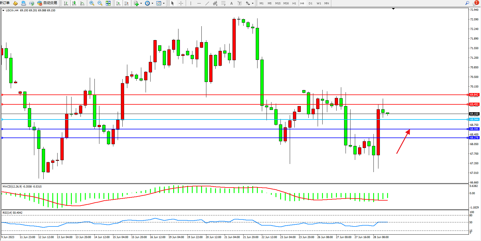 原油USOil——4小时K线图显示: