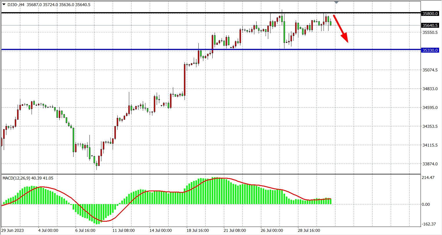 4小时图看,道指在高位35800受阻,同时在下方35330附近受支撑,MACD量能在零轴上缩量,行情进入高位盘整,支撑关注35330-35100附近,阻力35800-36000。