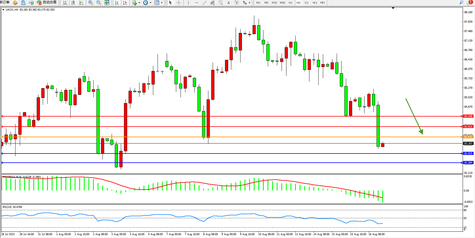布油维持83.303附近震荡,美国能源信息署(EIA):EIA俄克拉荷马州库欣原油库存 -83.7万桶,前值15.9万桶。库欣原油库存上周降至自4月以来的最低水平,上周美国原油出口量创下自2022年8月以来的最高水平,美国国内油田产量上周升至自2020年3月以来的最高水平。