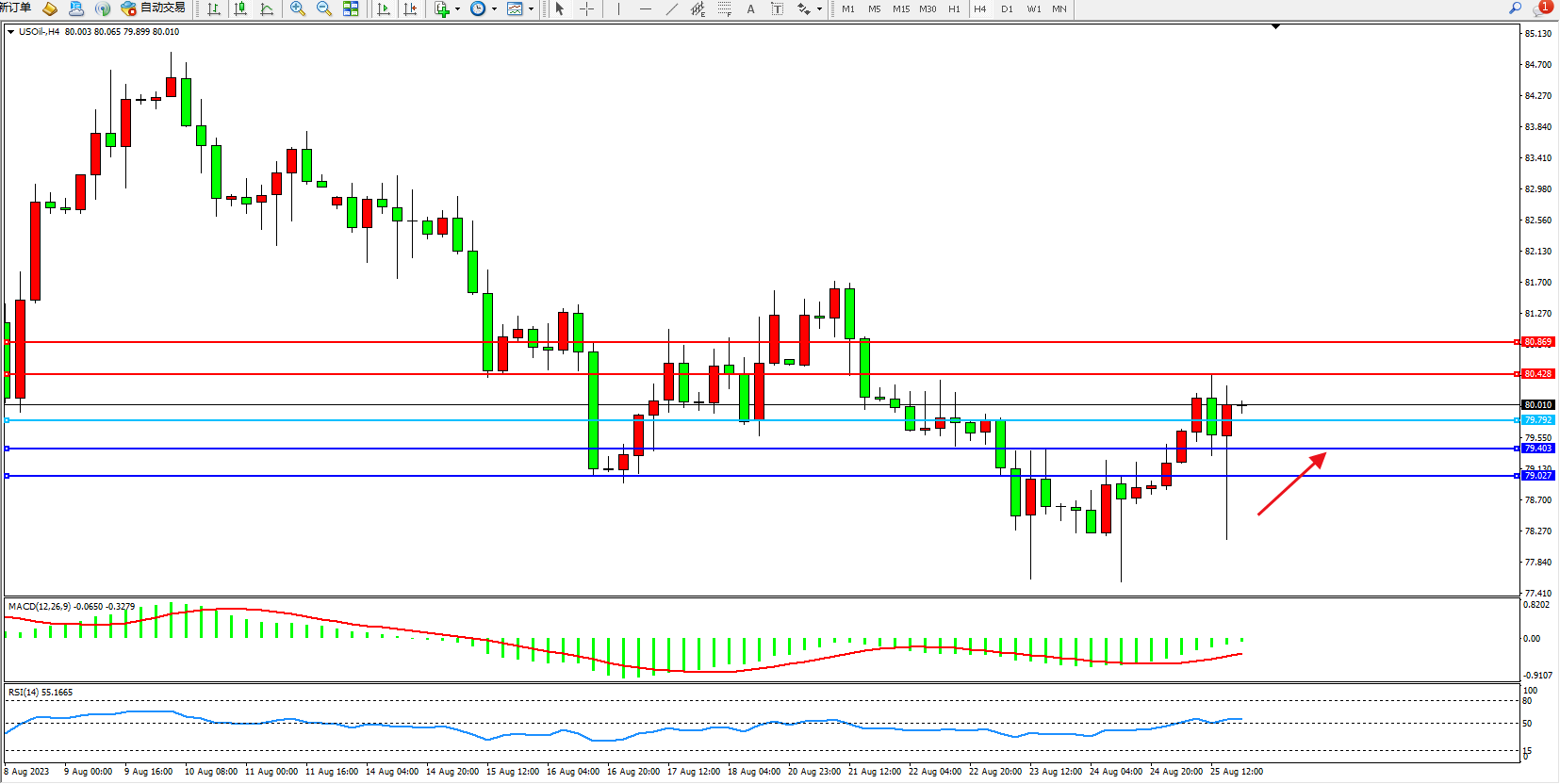原油USOil——4小时K线图显示: