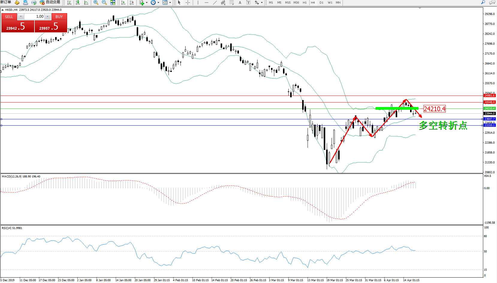 恒指HK50 ——4小时K线图显示: