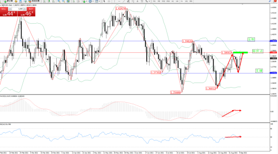 低位多头动力维持震荡上扬,纠结于布林带指标通道中上轨区间持续宽幅整理平移中,期间多次触及中上轨区间节点,上方压制关注1.39826附近,低位支撑关注1.37254附近,关注1.38903附近转折点,MACD指标低位多头动力整理回升至0轴线附近弱势徘徊中,RSI指标处于50均衡线上侧弱势整理,如图: