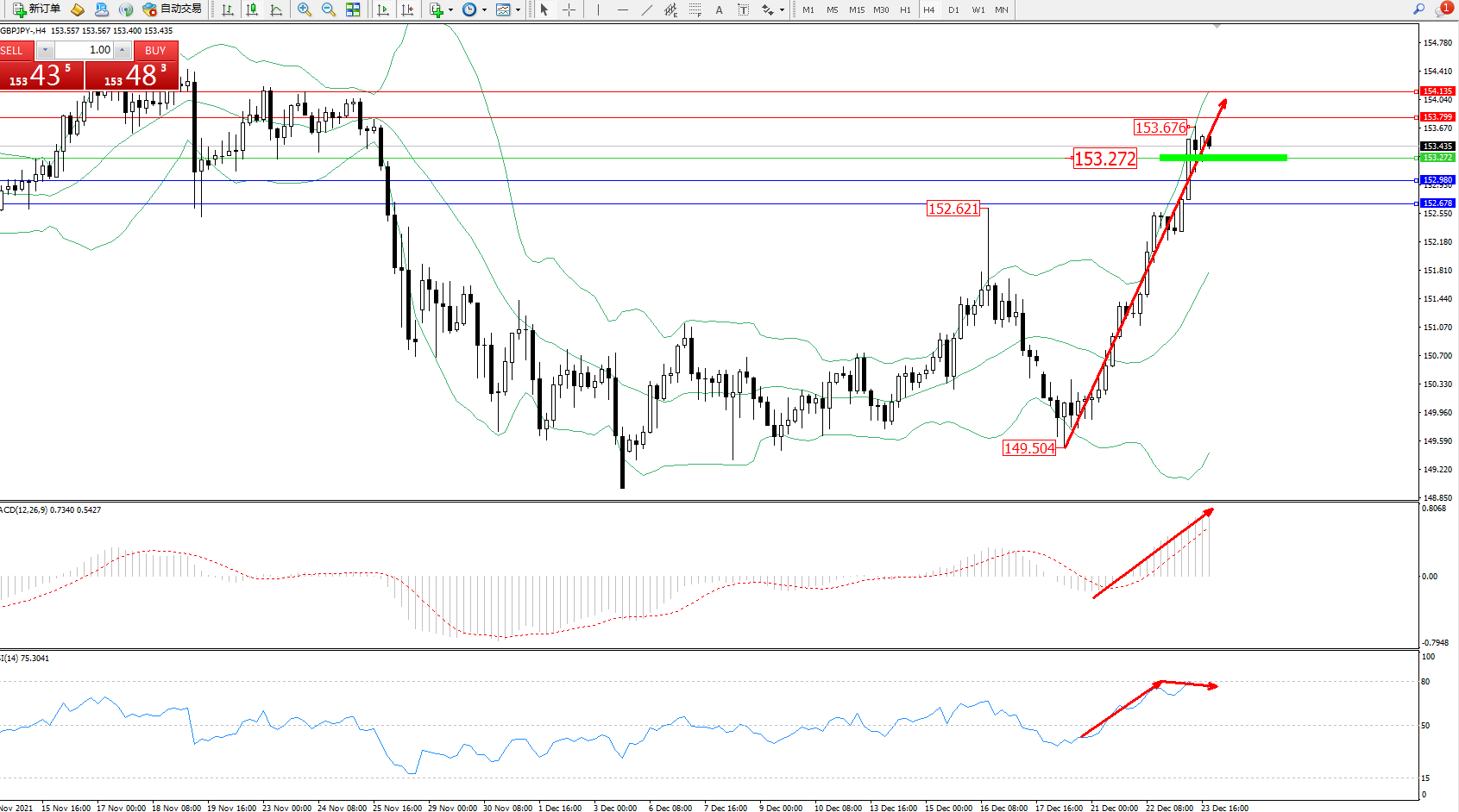 交易策略:153.272上方看涨,目标153.799、154.135