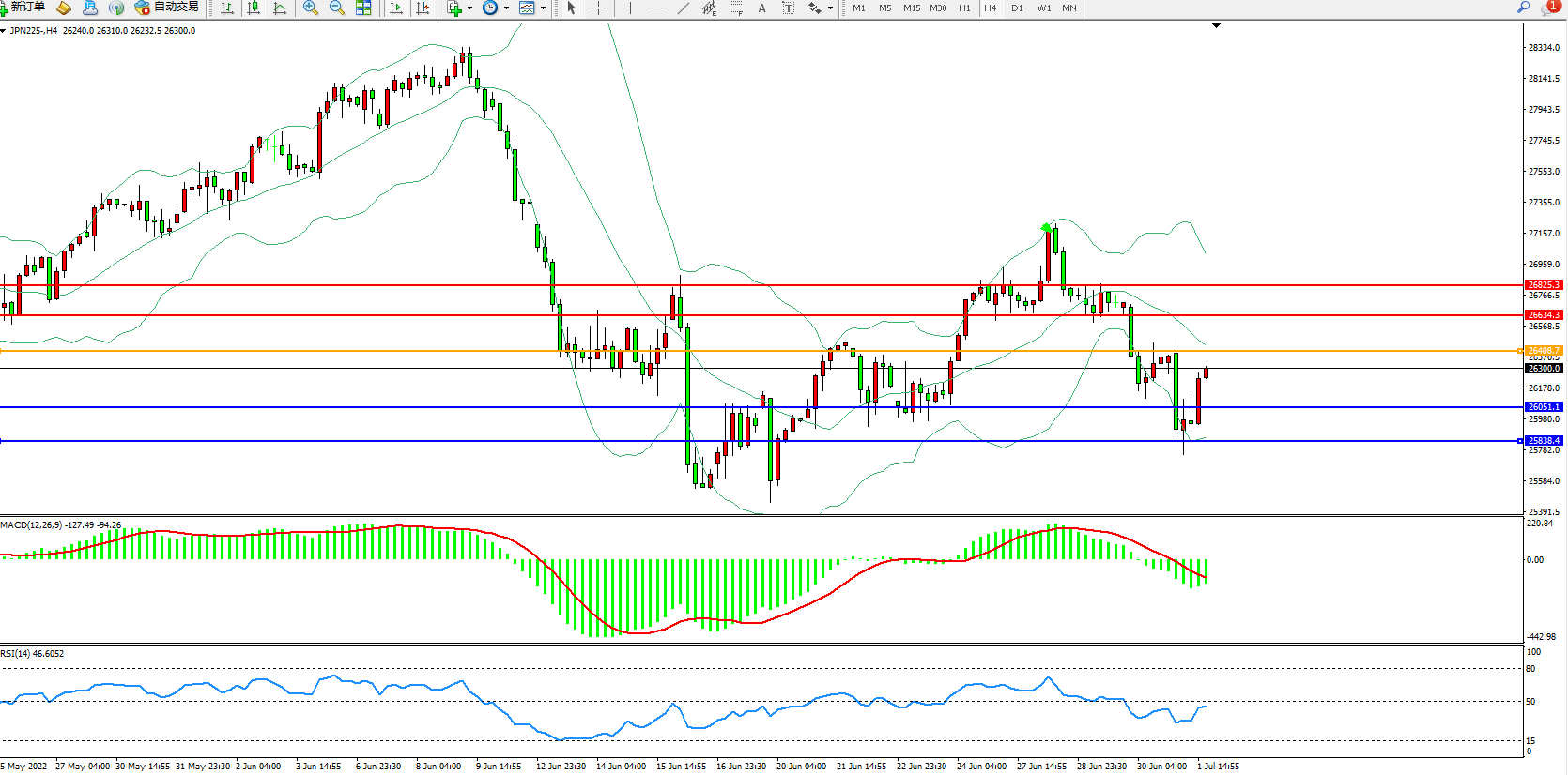日经指数JPN225——4小时K线图显示: