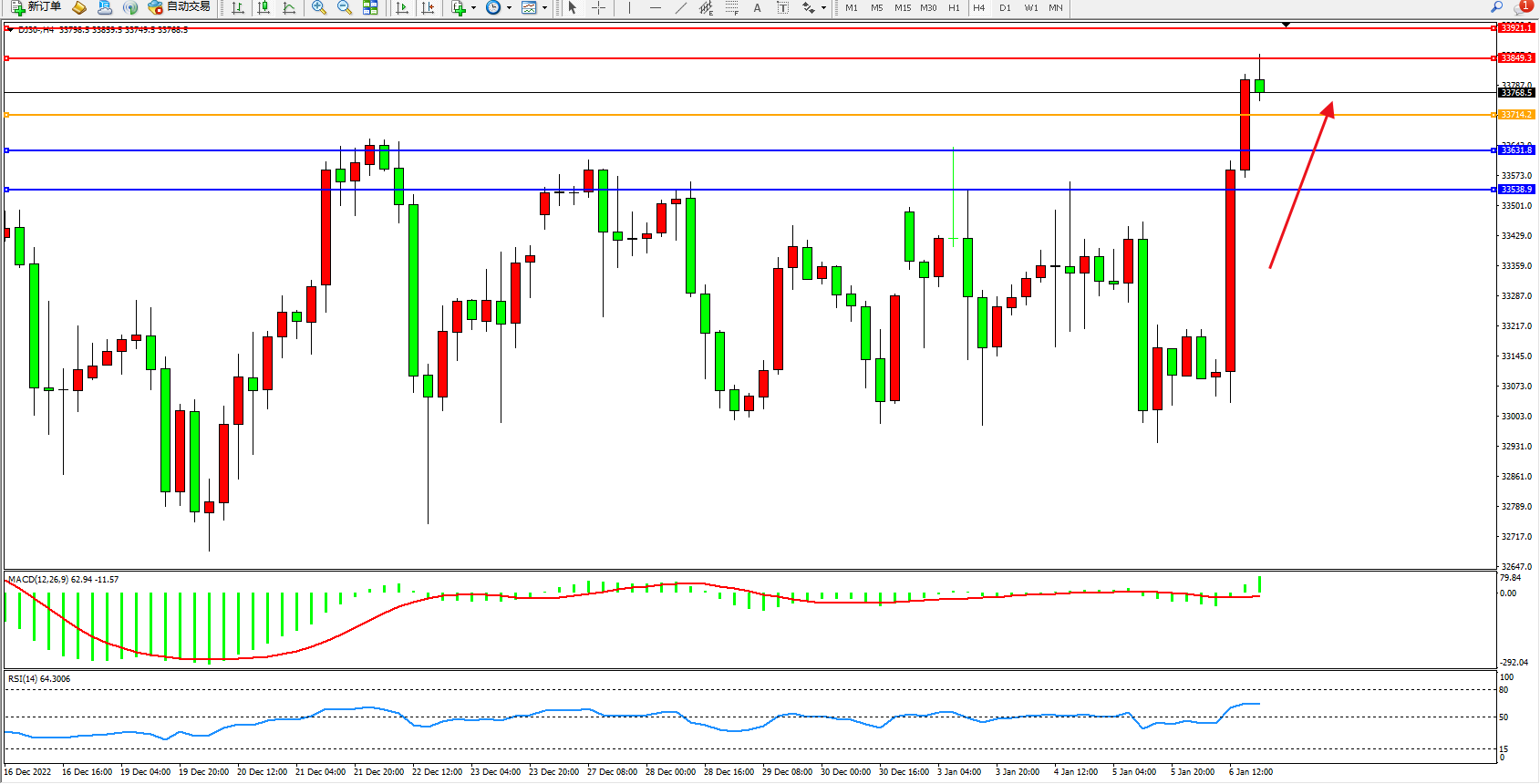 道琼斯指数DJ30——4小时K线图显示: