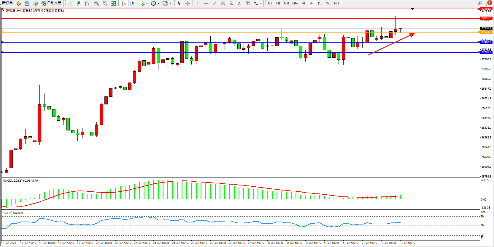 日经指数JPN225——4小时K线图显示: