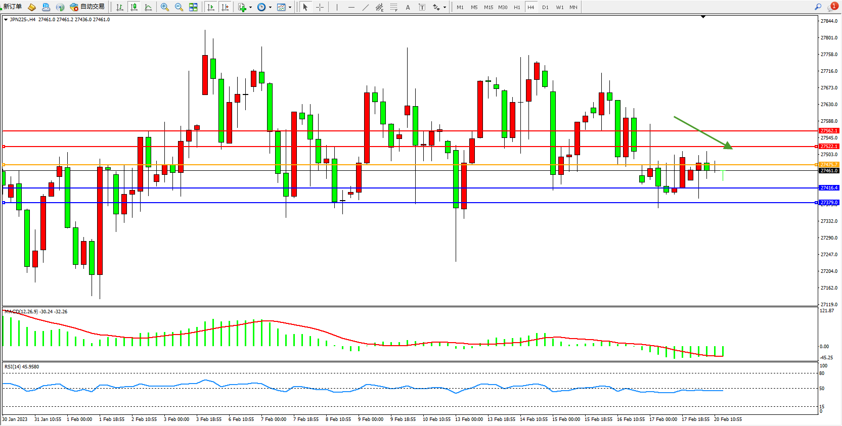 日经指数JPN225——4小时K线图显示: