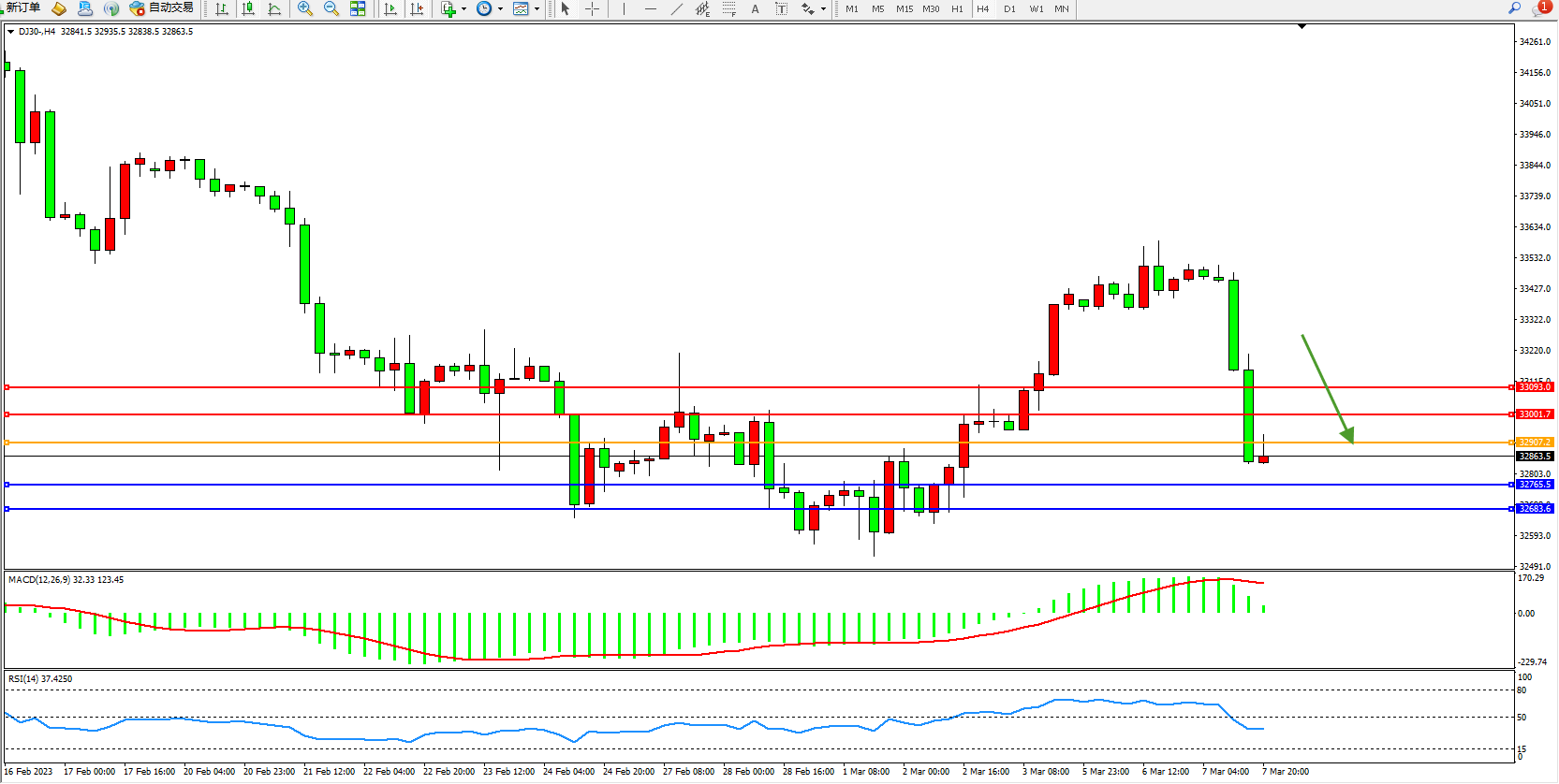 道琼斯指数DJ30——4小时K线图显示: