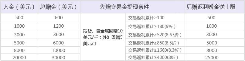 3、交易有效期,贵金属和期货品种每交易1手,可获得10美元返利可提赠金;外汇品种每交易1手,可获得5美元可提赠金;所有交易品种获得的可取赠金可相互累计;超出先获赠交易金部分按每月结算至用户交易账户,最高可返利30000美元。